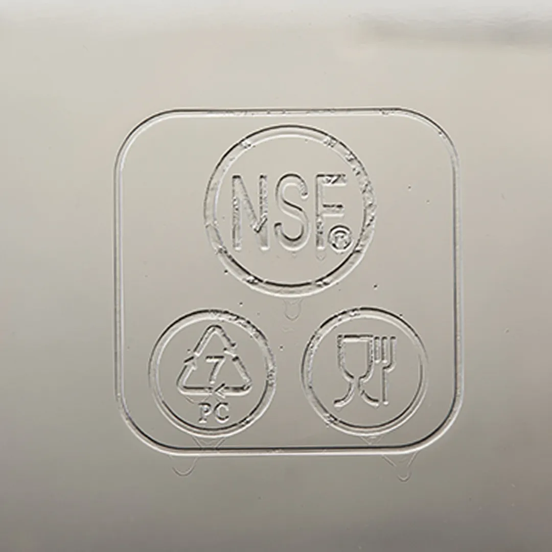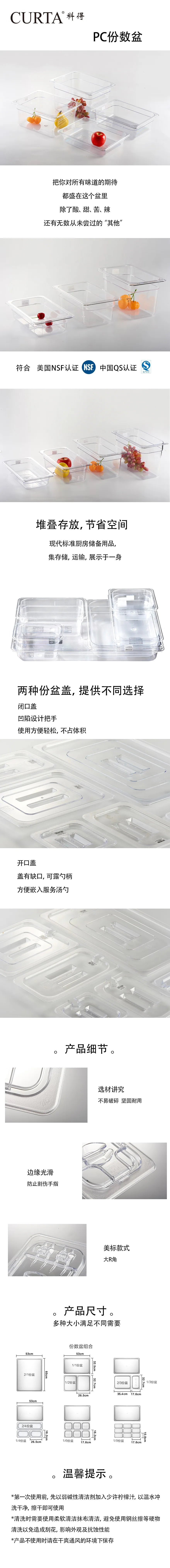 采用德国科思创COVESTRO(原拜耳)集团出品,Makrolon品牌、食品接触级的全新进口原料,成品全部通过美国NSF认证。PC材质。防摔,光滑,透明,不开裂,不变形,便于清洗。表面光滑不粘连,叠放时拿取容易。温度范围-40~99℃。肯德基、麦当劳等国际著名连锁餐厅使用中。